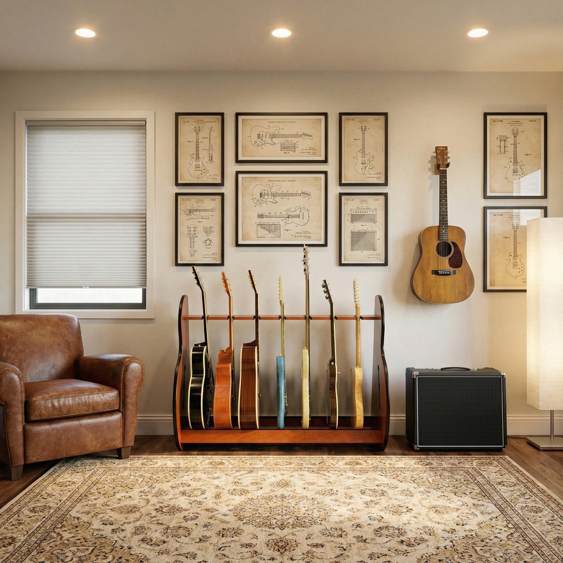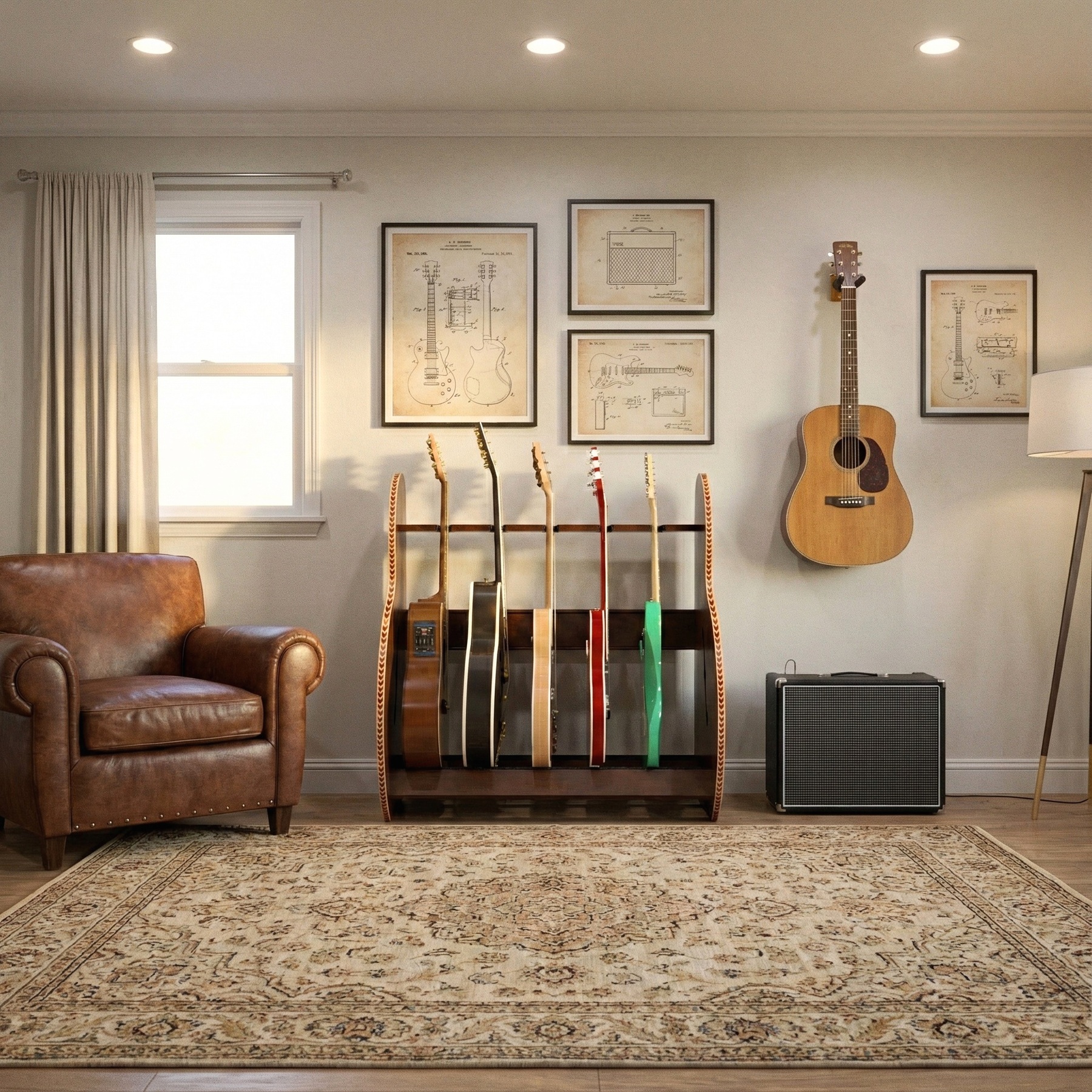 - Tidy up your space by arranging your guitars in a sleek, orderly stand